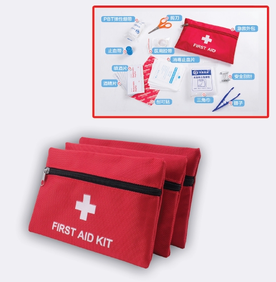 三角巾1塊、醫(yī)用別針10只、PBT彈性繃帶1卷、醫(yī)用剪刀1把、消毒紗布片2包、乳膠止血帶1只、無紡布膠帶1卷、酒精片10片、創(chuàng)可貼10片、碘伏片4片、醫(yī)用鑷子1把、急救外包1只、醫(yī)用棉簽25根。