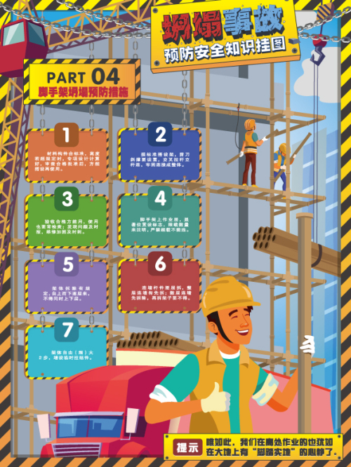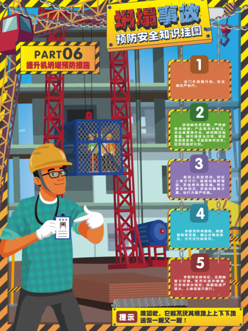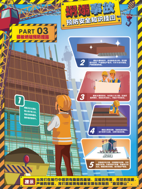 本掛圖通過對坍塌事故識別及土方坍塌、模板坍塌、腳手架坍塌、拆除工程坍塌、提升機坍塌等不同類型坍塌事故預防與控制措施進行了提煉,為管控坍塌事故風險提供指導。