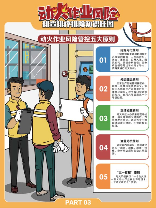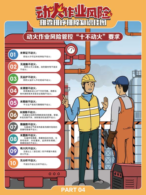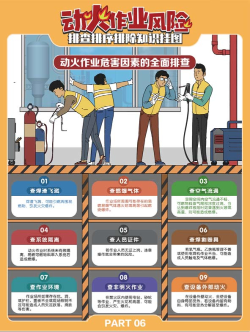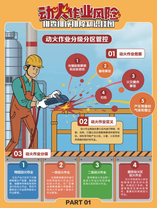 由于動火作業引發的火災事故較多,本掛圖通過對動火作業分級分區要求、風險識別、管控原則、違章行為控制、隱患排查等進行闡述,從而為動火作業全過程風險管控提供指導。