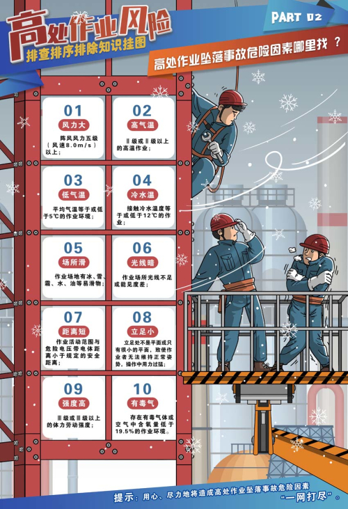 高處作業風險管控是安全管理的重要內容,本掛圖通過對高處作業風險因素識別、安全措施使用、預防行動落實、作業過程監督闡述,為高處作業安全提供指導。