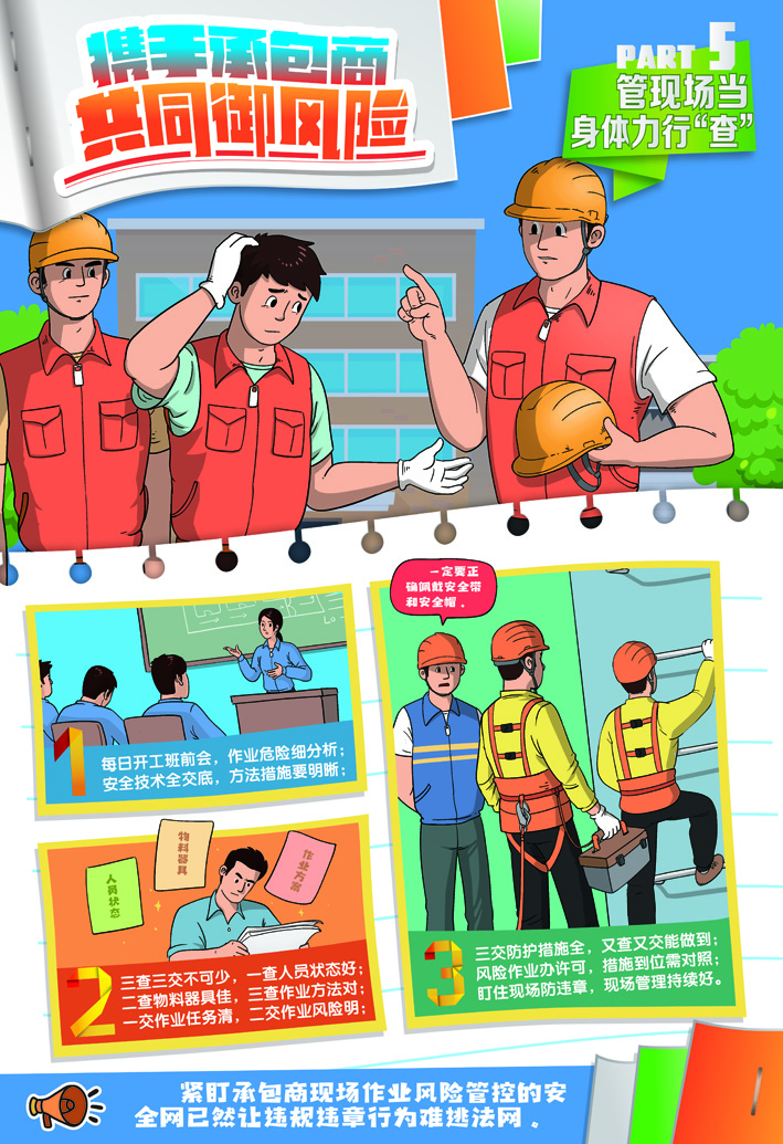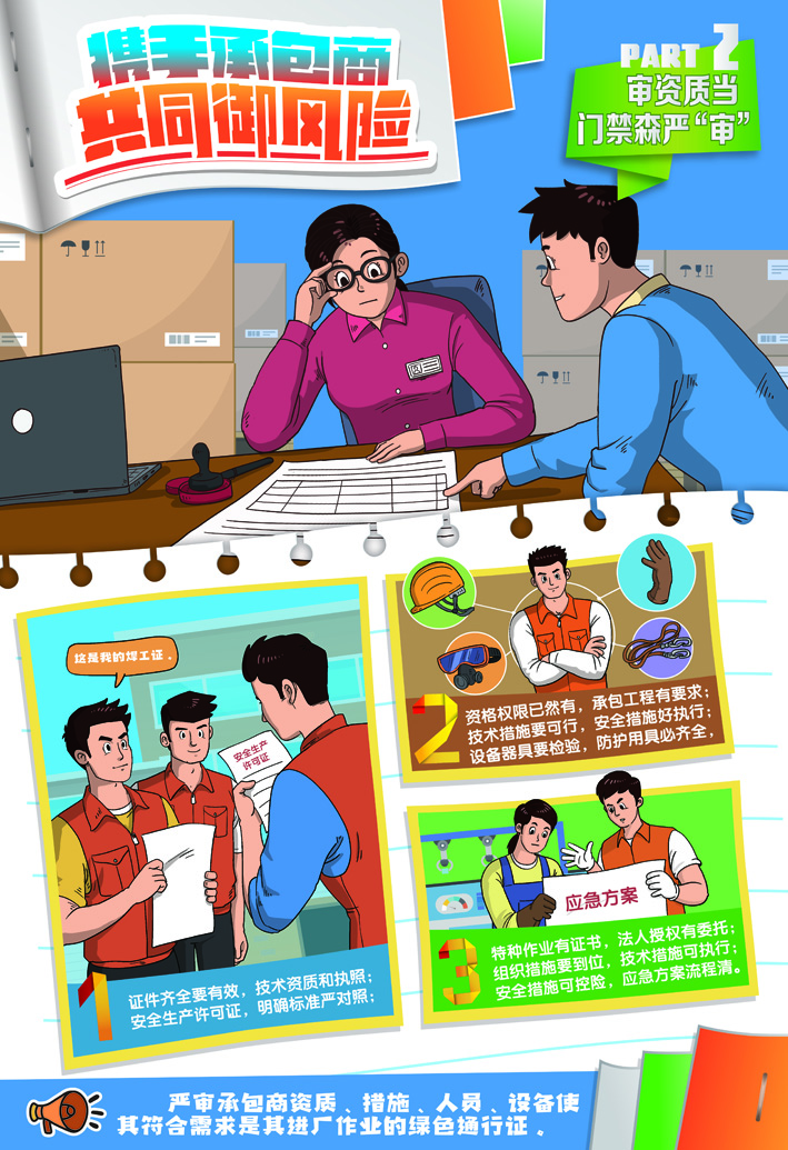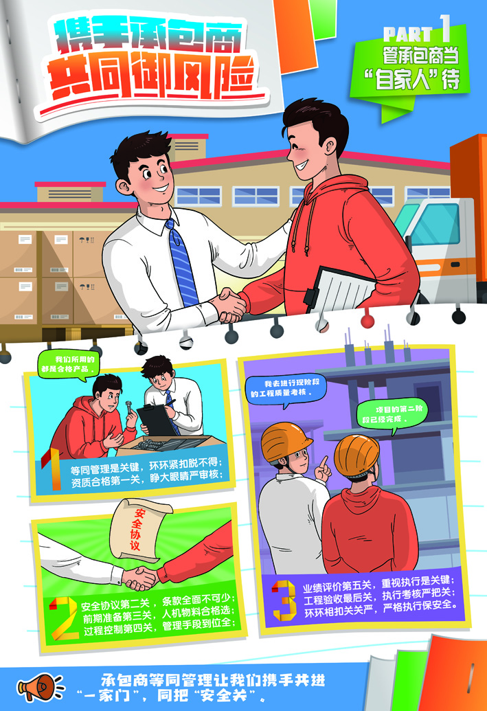掛圖從承包商管理定位出發(fā),從審資質(zhì)、簽協(xié)議、抓過(guò)程、管現(xiàn)場(chǎng)等角度,對(duì)如何管控承包商作業(yè)風(fēng)險(xiǎn)提供了最佳路徑和方法。