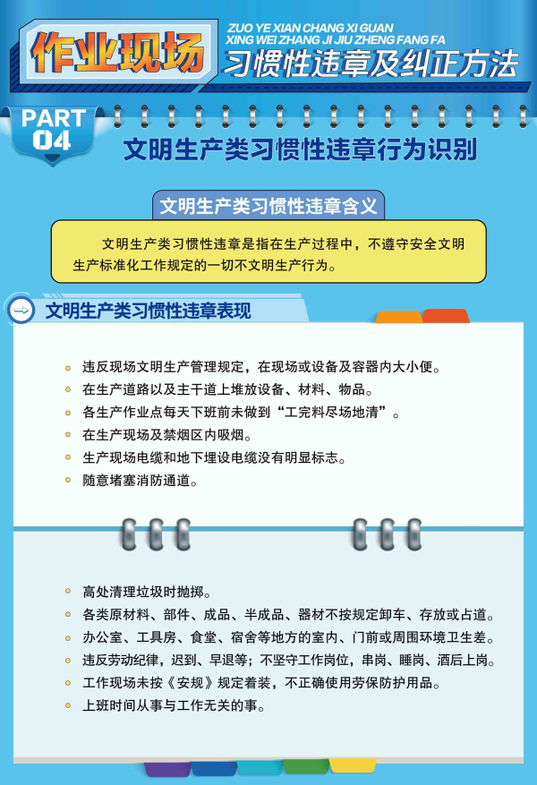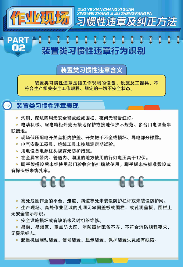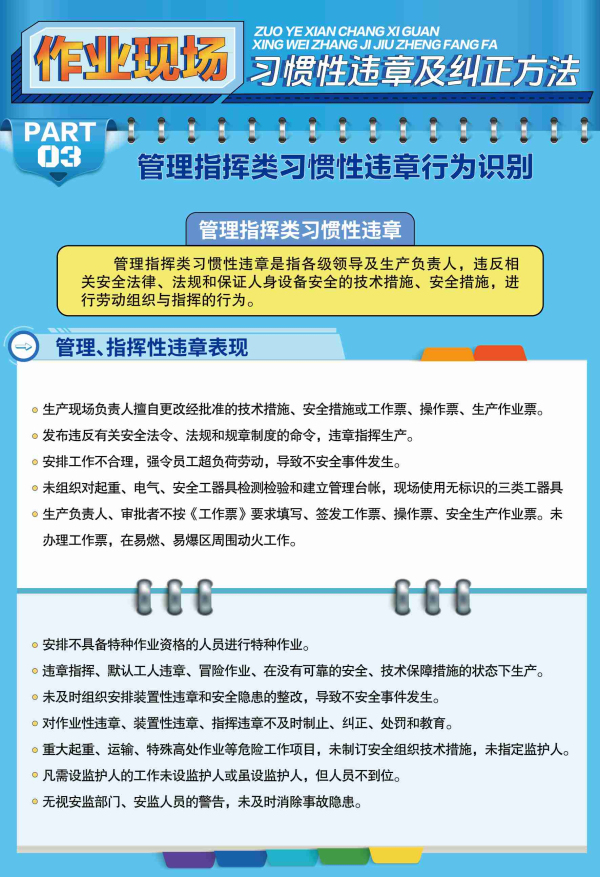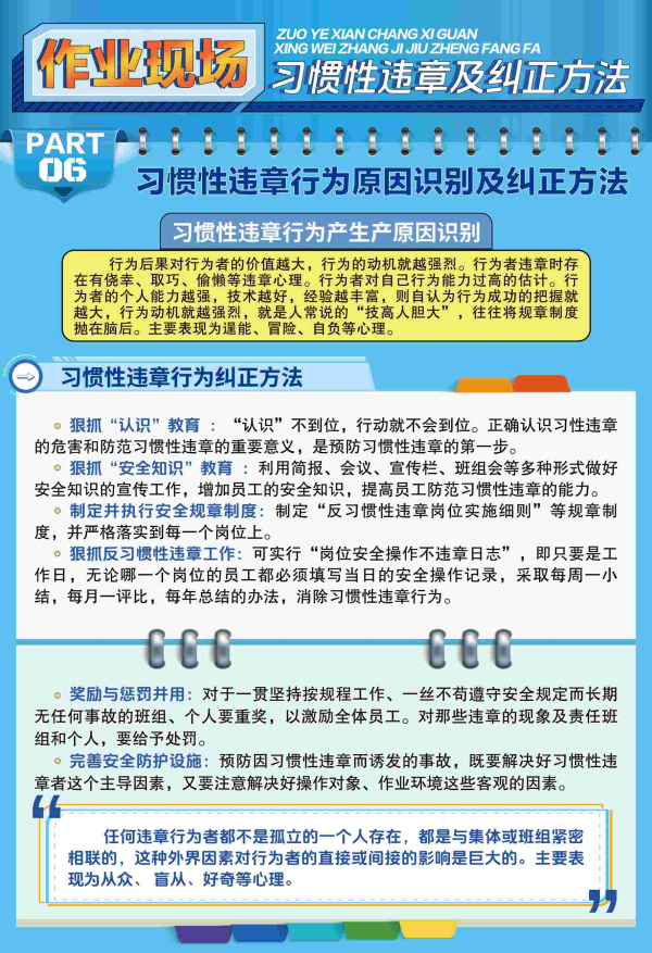 本掛圖旨在系統的讓員工了解作業現場都有哪些習慣性違章、習慣性違章的原因、習慣性違章的糾正方法等,從而提高員工對安全規章制度的認識,加大安全教育力度,營造一個“人民至上 生命至上”的安全文化氛圍,適用于各類企業員工進行安全教育。