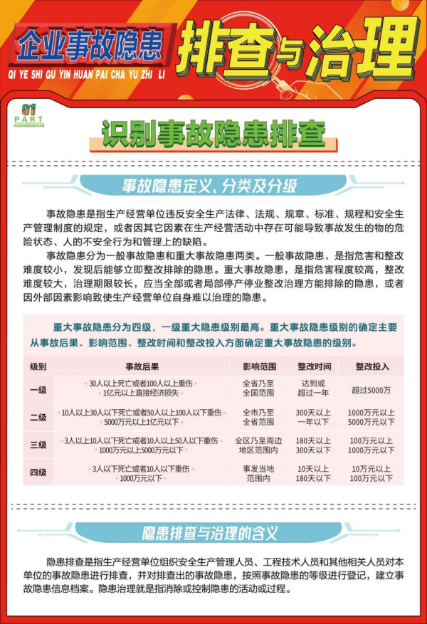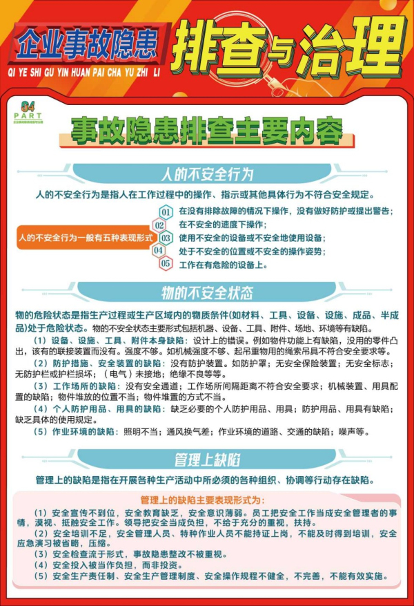 本掛圖旨在通過直觀的圖示和簡潔的文字說明,幫助大家識別日常生活中常見的隱患,提升個人及家庭的安全意識,學習基本的安全防范措施,減少意外事故的發生,共創安全和諧的生活環境。通過這份安全隱患掛圖的學習,我們期望每個人都能成為自己和他人的安全守護者,共同營造一個更加安全、健康的生活與工作環境。