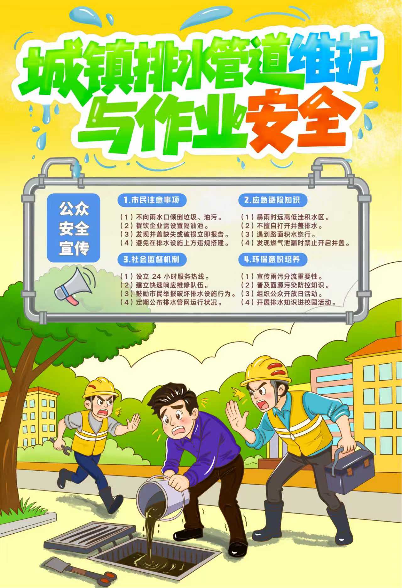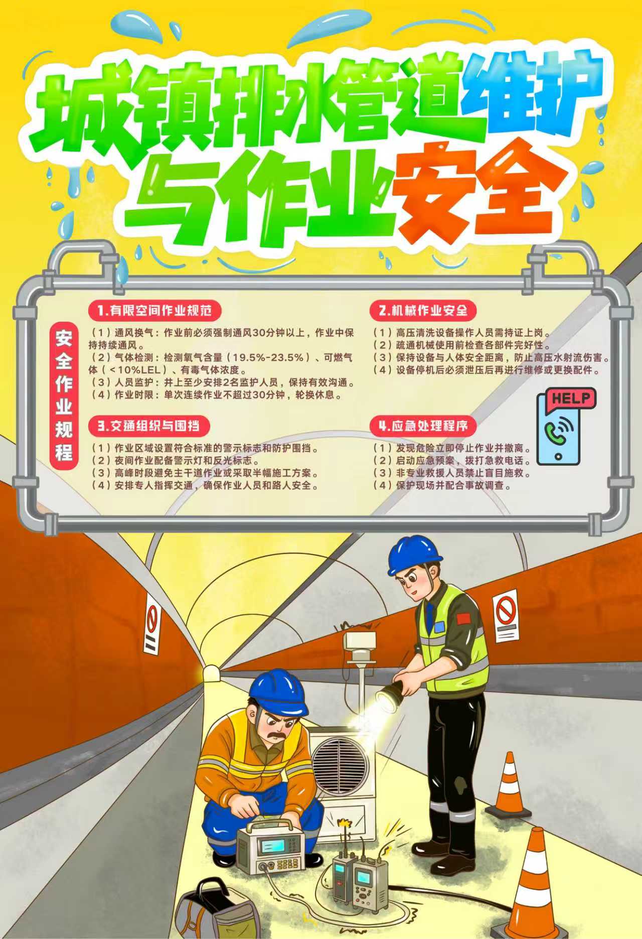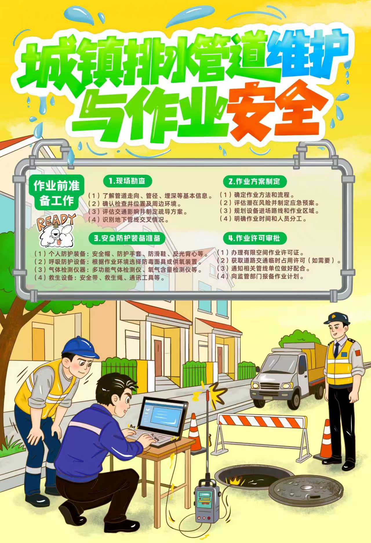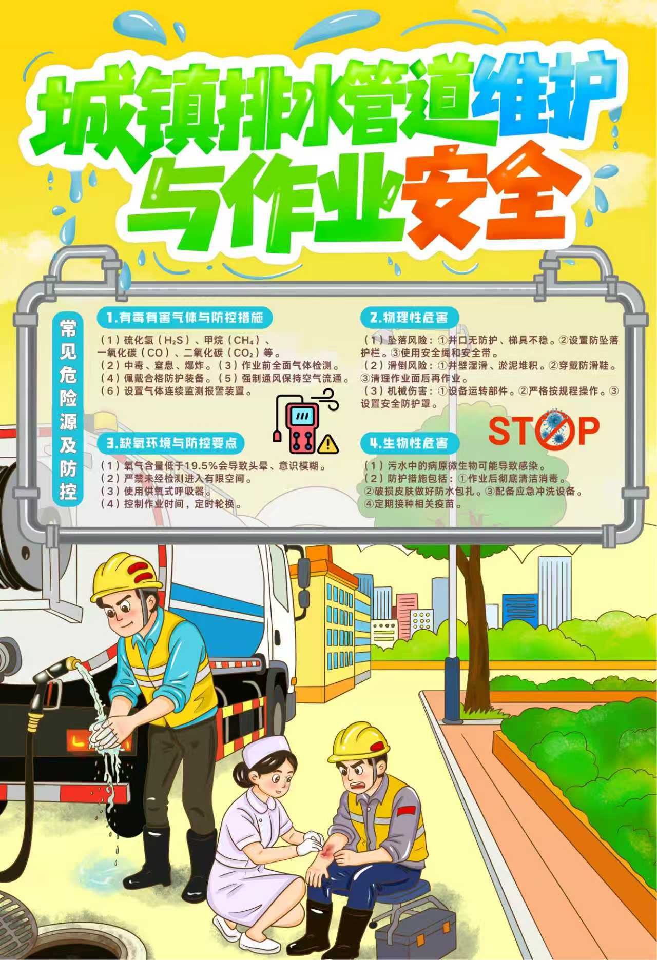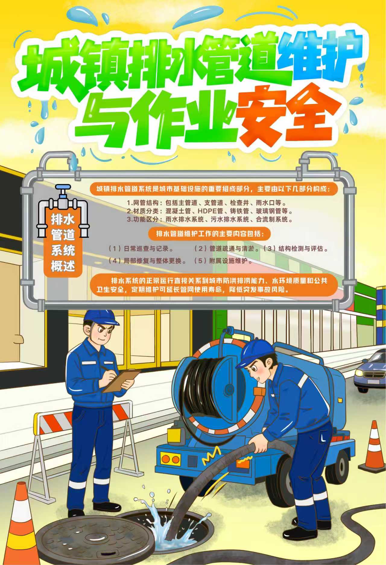 本掛圖介紹城鎮排水管道系統構成,規范作業準備、安全操作流程,明確危險源防控措施,講解維護檢測技術,普及公眾安全知識,全面保障排水管道維護作業安全與城市管網穩定運行。