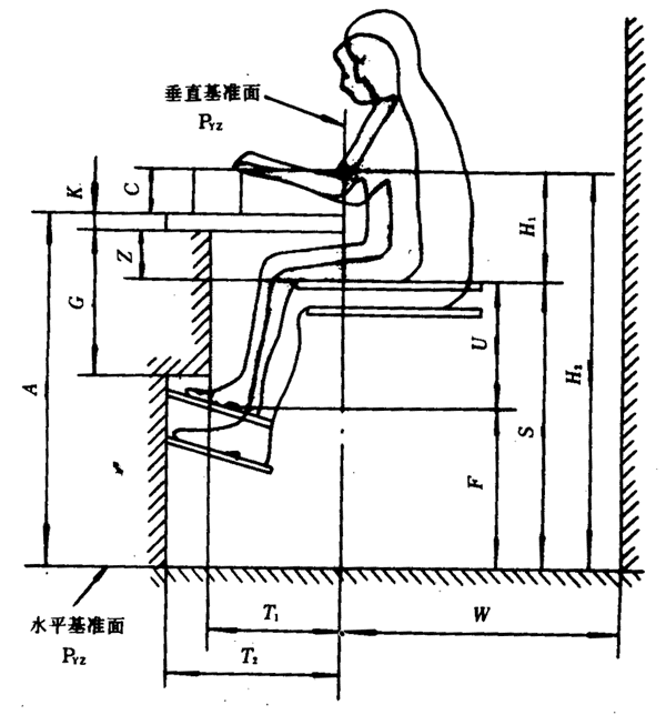 坐姿時手操作平面與座位設計平面之間的距離〔見圖1(a)和圖3〕。