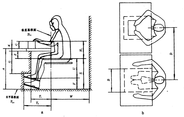 5.3.2.3 在設計女性和男性共同使用的坐姿工作崗位時,應選取男性的相對高度H1計算工作面高度A;同時座位面高度S和腳支撐高度F必須有較大的調節范圍,以適應女性作業人員。