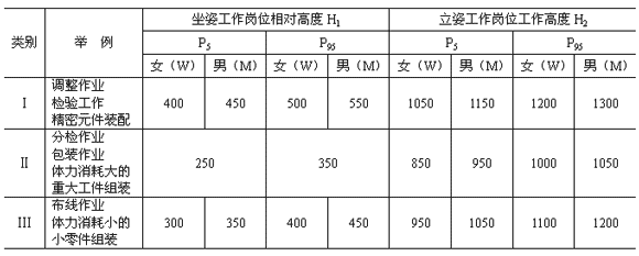 以作業人員有關身體部位的第5或第95百分位數值(見GB/T 12985和GB 10000)推導出與作業無關的工作崗位尺寸。見表1。