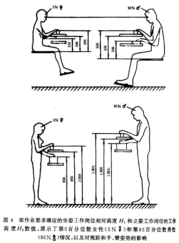 以Ⅰ、Ⅱ兩類相應的高度平均值分別確定坐姿、立姿工作崗位的女性、男性的第5和第95百分位數的相對高度H1和工作高度H2。
