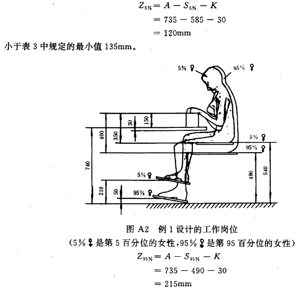 5.3.4.2 根據作業要求的類別,從表2中查出工作高度H1(5%)和H1(95%);分別按5.2.6條和5.2.7條計算座位面高度S調整范圍和腳支撐F調整范圍;核算大腿空間高度Z是否大于表3中規定的最小限值。