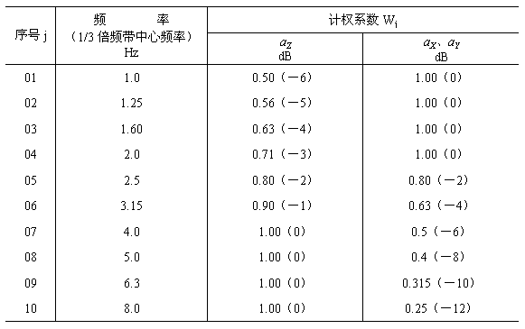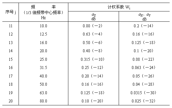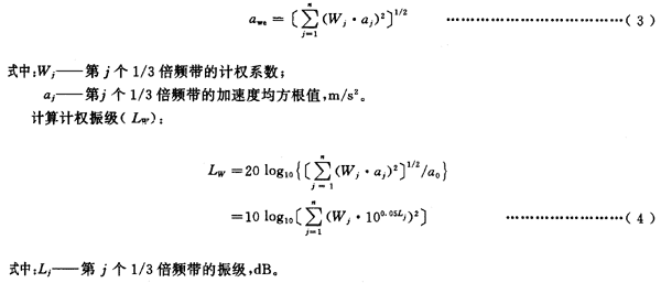 4.3.5 為了用一個單值表示不同軸向的人體全身振動環境,可進行振動量值的頻率計權分析。分析可由具有計權特性網絡的分析儀完成,亦可在1/3倍頻程分析的基礎上按以下公式計算。分析結果可表示為均方根值或分貝值。