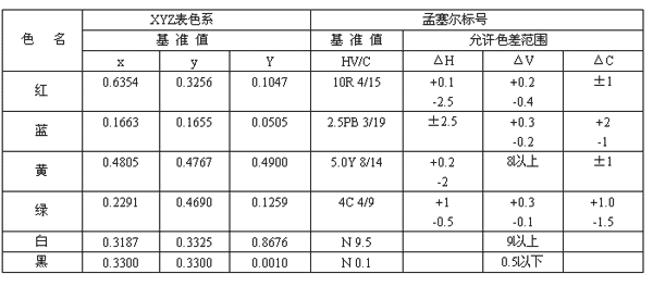 ③表中色用CIE 1964 10°視場(chǎng)XYZ表色系和孟塞爾標(biāo)號(hào)表示。