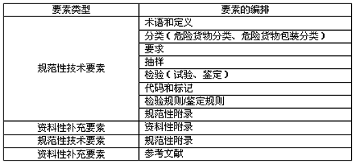 危險(xiǎn)貨物及危險(xiǎn)貨物包裝檢驗(yàn)標(biāo)準(zhǔn)的一般構(gòu)成和要素見表1。