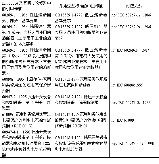 本標準等同采用IEC60364-4-43:1977《建筑物電氣裝置 第4部分:安全防護 第43章;過電流保護》及其第1次修改(1997)。由于該標準中引用的標準未被完全等同采用為中國標準,為了有利于本標準的使用,表A1特別列出該標準中引用標準與采用這些標準的中國標準的對應關系。