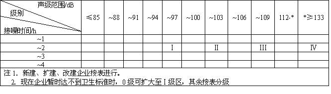 為了便于實(shí)際操作,簡(jiǎn)化了噪聲危害指數(shù)的計(jì)算過(guò)程,制定了噪聲作業(yè)分級(jí)級(jí)別表,按下表進(jìn)行分級(jí)