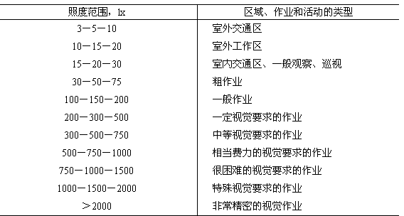 各種不同區域作業和活動的照度范圍值應符合表1的規定。一般采用表1的每一照度范圍的中間值。當采用高強氣體放電燈作為一般照明時,在經常有人工作的場所,其照度值不宜低于50lx。