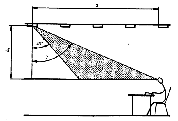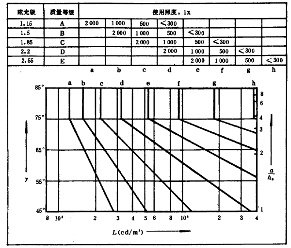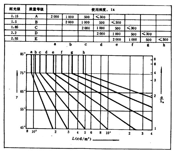 A1.3.3 燈具在/角方向的平均亮度值,可由γ角方面的光強值除以發光面在與該方向垂直面上的投影面積求得。將計算的燈具亮度值畫在選擇好的圖中與相應的亮度曲線比較,若燈具亮度低于限制曲線亮度,即燈具亮度曲線在限制曲線左邊,則眩光的限制滿足要求;若燈具亮度高于限制曲線亮度,即燈具亮度曲線在限制曲線右邊,則此燈具不能滿足該場所眩光限制的要求;若燈具亮度曲線與限制曲線相交,則必須保證室內主要觀察方向上的燈具亮度低于限制亮度。