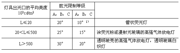 燈具亮度除應滿足亮度曲線法的限制要求外,還應按表A1限制燈具的最小遮光角。