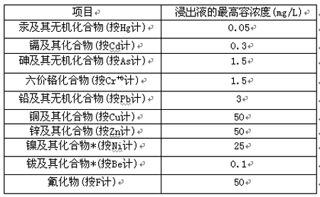 表 1 有色金屬工業固體廢物浸出毒性鑒別標準