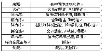 1.1有色金屬工業固體廢物是指采礦、選礦、冶煉和加工過程及其環境保護設施中排出的固體或泥狀的廢棄物。其種類包括:采礦廢石、選礦尾礦、冶煉棄渣、污泥和工業垃圾,無處理設施、長期堆存并對環境造成影響的生產過程排出的固體物,亦列為固體廢物。