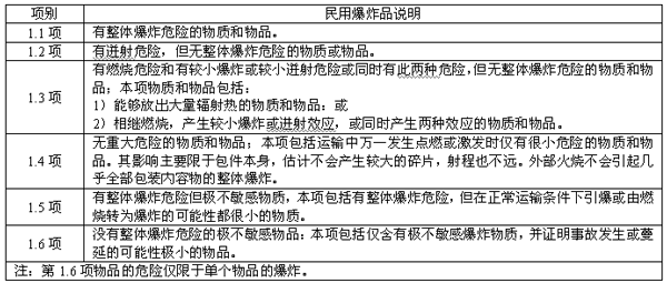 危險品按照《關于危險貨物運輸的建議書 規章范本》(第13修訂版)的規定分為9類,民用爆炸品屬于第1類、第1類具體劃分為6項,見表1。