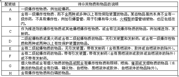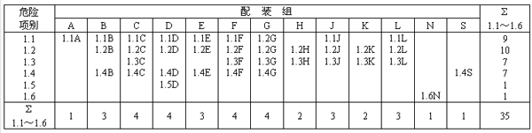 按民用爆炸品的理化性能、爆炸性能、內外包裝方式、特殊危險性等不同特點,劃分為A、B、C、D、E、F、G、H、J、K、L、N和S共13個配裝組,見表2。
