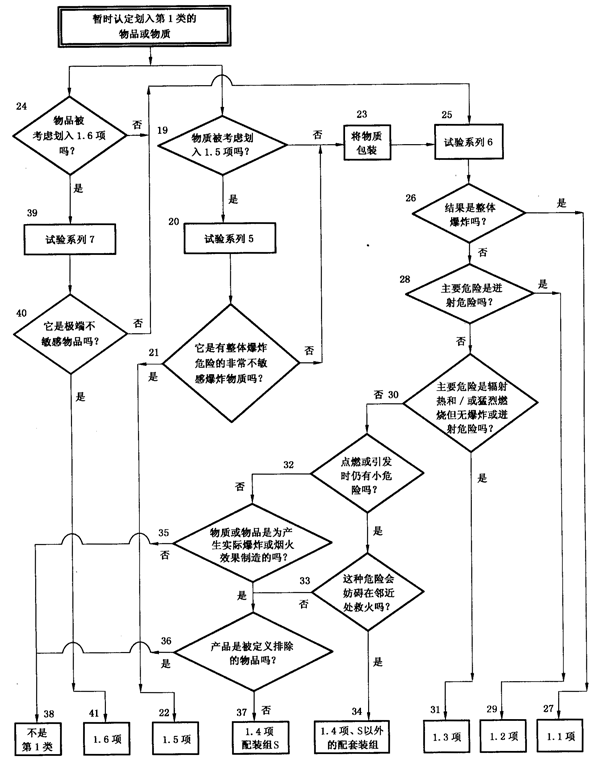 B.1 爆炸品分類程序:對已被暫定為爆炸品的物質或物品,應按圖B.1所示的程序進行分析和試驗,并結合其他有關資料,以及曾發生過的偶然事故或對類似的已分類貨物的認定進行綜合分析,確定其項別。