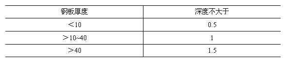 1.6 焊縫應均勻平整,不應有裂紋、夾渣、燒穿、未焊透等缺陷。重要部位的焊縫還不應有氣孔,且咬肉長度不得超過焊縫長度的15%,咬肉深度應符合表1的規定。
