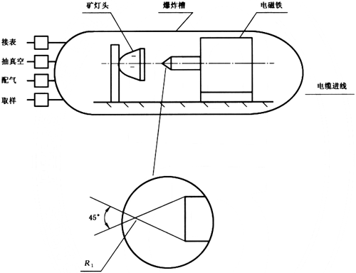 將充足電并正常點亮的礦燈放入燈頭穿刺試驗裝置(見圖1)內,關閉好試驗裝置,使裝置內甲烷與空氣混合物的甲烷濃度達到7.5%~8.0%(體積比),然后同時擊破燈面玻璃和燈泡。試驗一盞礦燈,共試驗100次。
