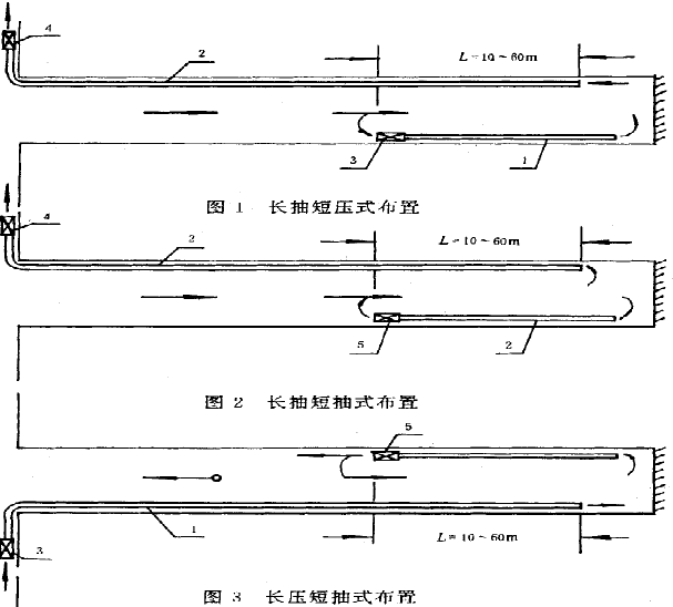 a.“長抽、短壓”方式 主導局部通風機和主導風筒作抽出式通風,位于掘進巷道中的局部通風機和風筒作壓入式通風的方式,見圖1。