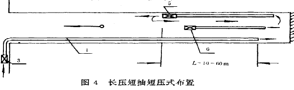 c.“長壓、短抽”方式 主導局部通風機及主導風筒作壓入式通風,位于掘進巷道中的局部通風機(或濕式除塵通風機或水射流通風機)和風筒作抽出式通風的方式,見圖3。