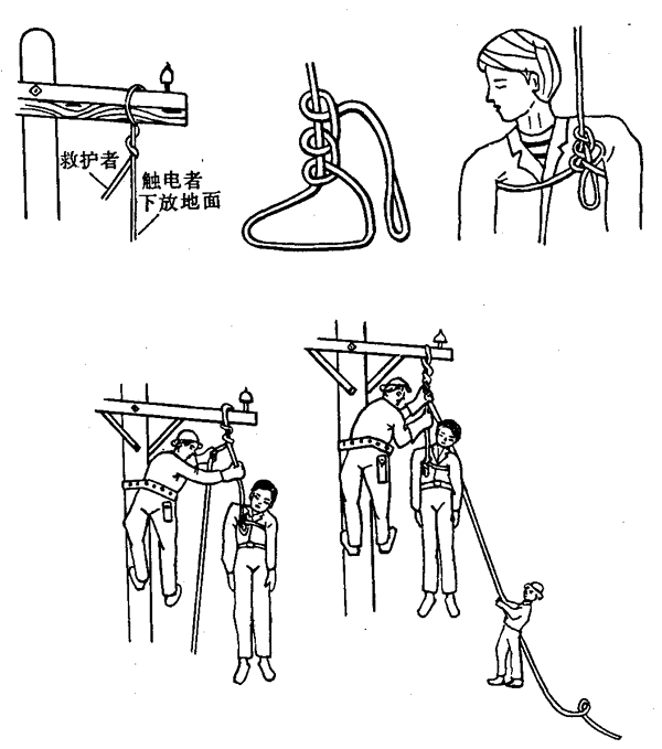 2.9.3.4 高處發生觸電,為使搶救更為有效,應及早設法將傷員送至地面。在完成上述措施后,應立即用繩索參照圖8所示方法迅速將傷員送至地面,或采取可能的迅速有效措施送至平臺上。