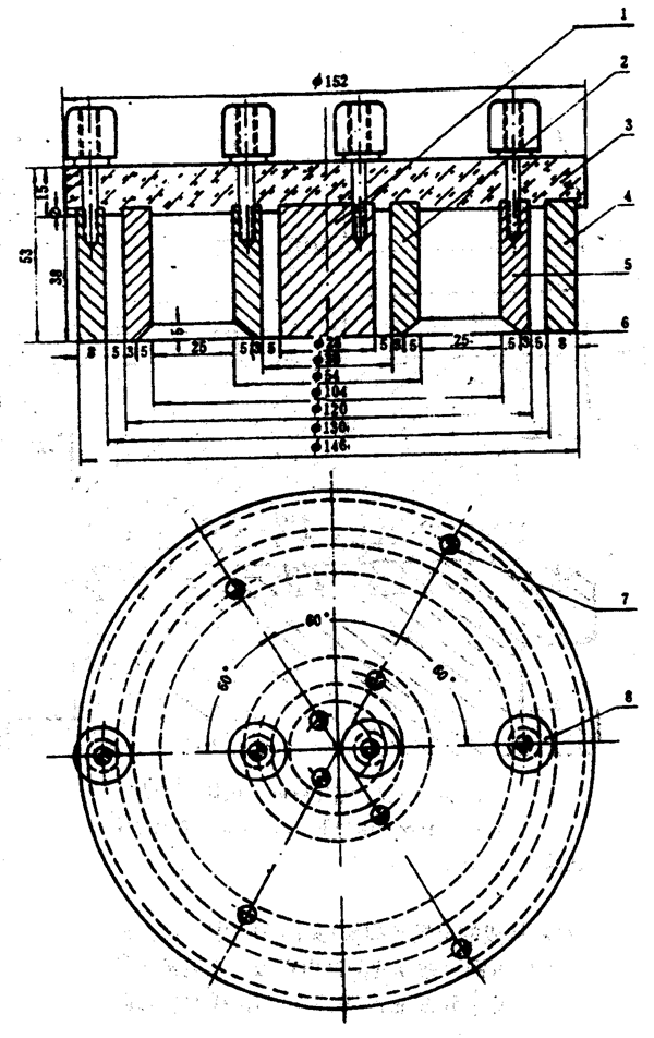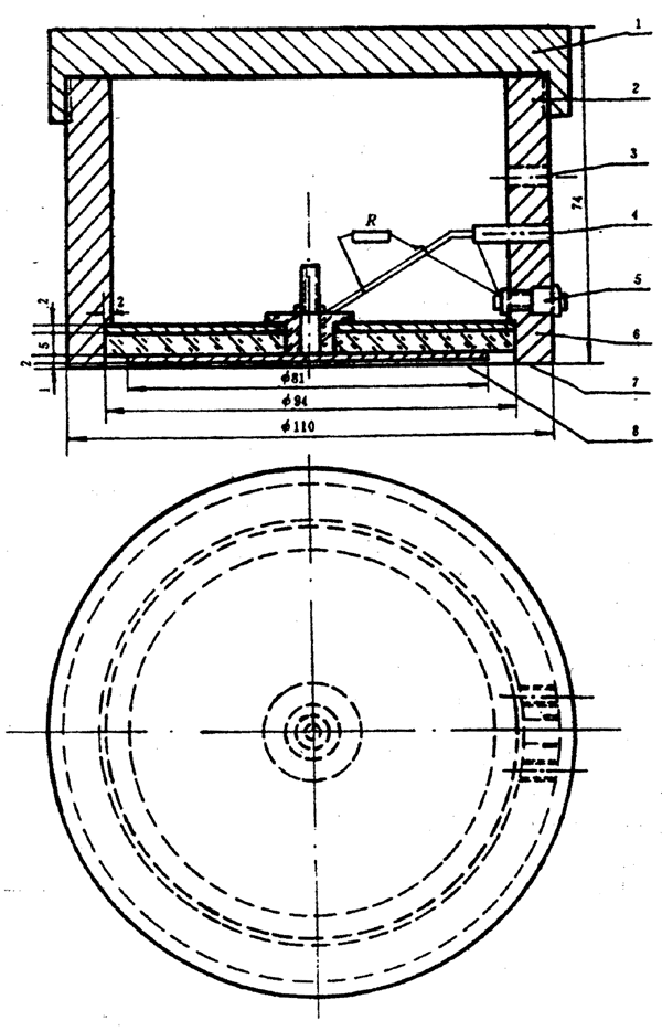 1―中心圓柱形電極;2,4,5―環(huán)形電極;3―有機玻璃絕緣板;6―與試樣接觸的水平表面;7―定位螺絲;8―接線柱