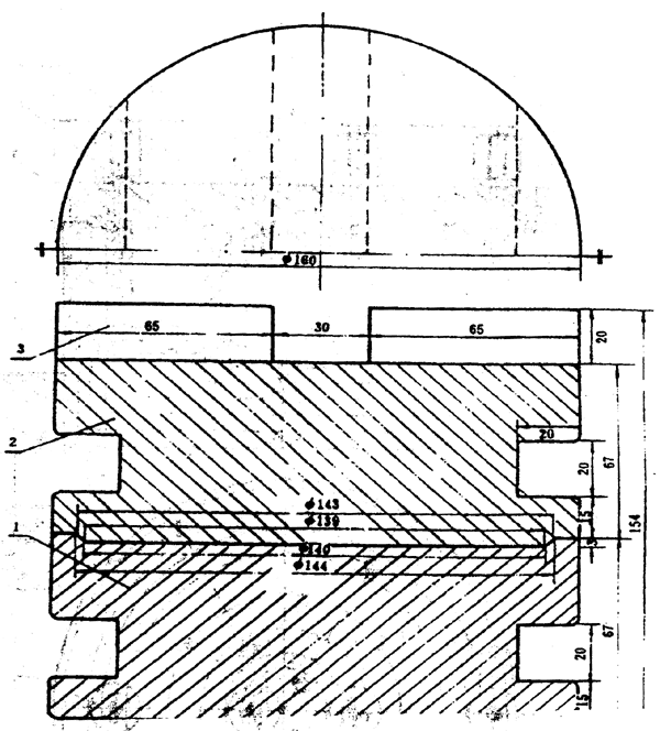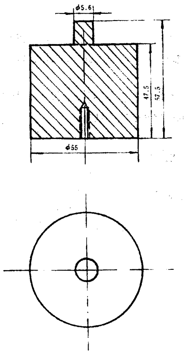 c. 一個圓柱形四端環(huán)形電極,其四個圓環(huán)用厚度為15mm的有機玻璃圓盤裝配在一起,底面加工成同一水平面,并鍍以5μm厚的黃金。電極總柱高為53mm,有效測試面是一個內(nèi)圓直徑為44mm、外圓直徑為114mm、寬為35mm的環(huán)形面。電極材料黃銅,自重2.8kg,附加重量20kg(電級尺寸詳見圖2a,電極附加重塊尺寸見圖2b)。
