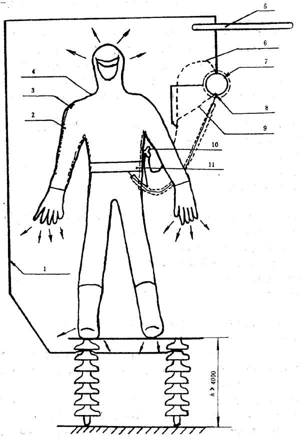 1―旁路等電位線;2―人體皮膚;3―絕緣連褲內(nèi)衣;4―屏蔽服;5―高電位線;6―測量電流I