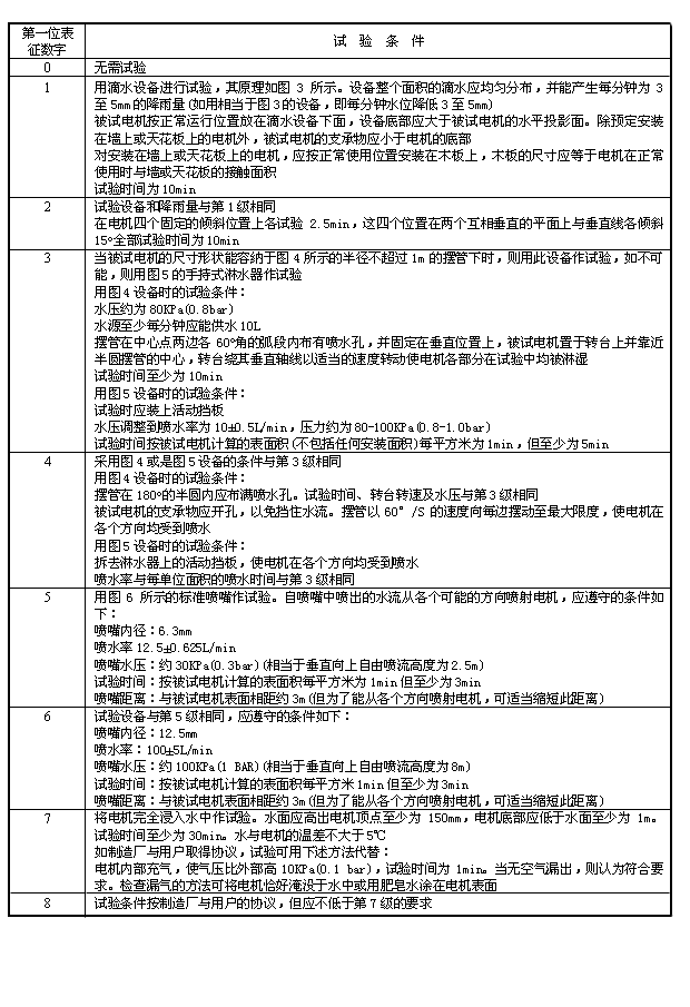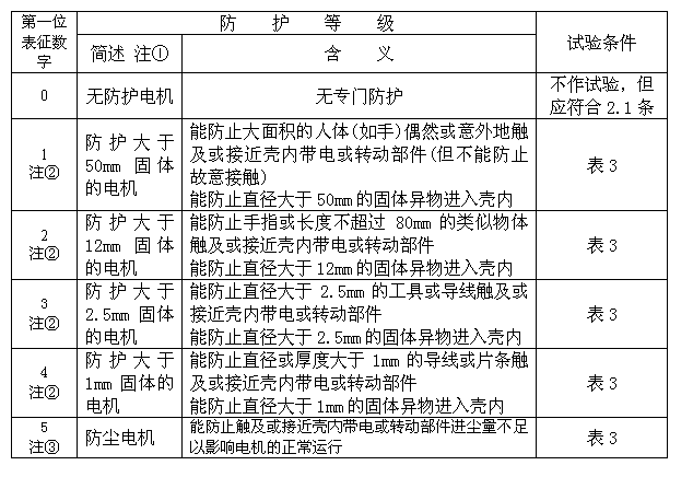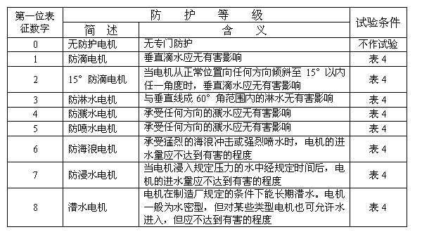 表2中“含義”一欄說明第二位表征數字所代表的每一防護等級外殼的防護型式細節。如外殼符合某一防護等級時亦符合所有低于該防護等級的各級,除有懷疑外,不必再作較低防護等級的試驗。