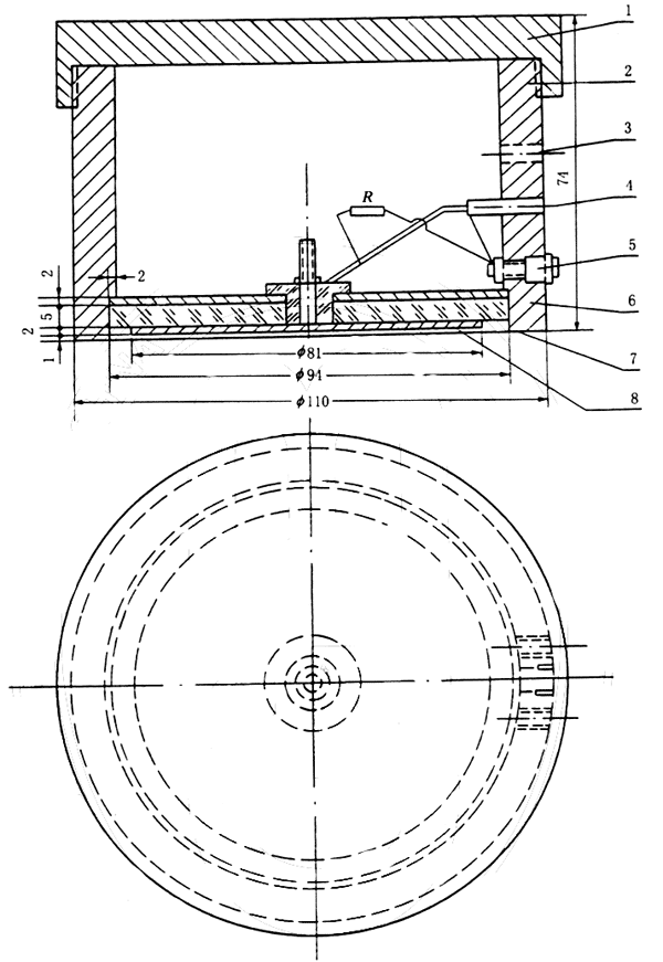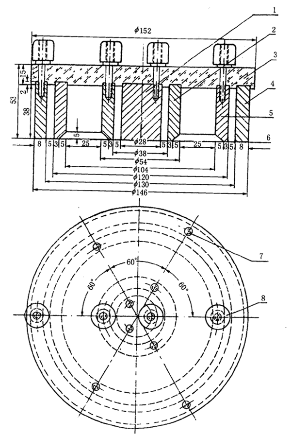 1―中心圓柱形電極;2,4,5―環(huán)形電極;3―有機玻璃絕緣板;6―與試樣接觸的水平表面;7―定位螺絲;8―接線柱