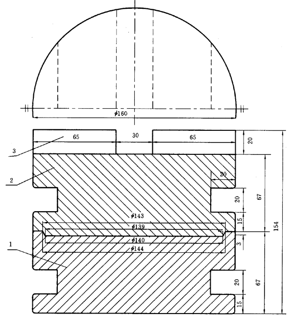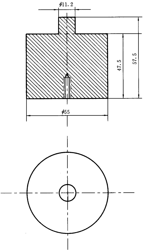 c) 一個圓柱形四端環(huán)形電極,其四個圓環(huán)用厚度為15mm的有機玻璃圓盤裝配在一起,底面加工成同一水平面,并鍍以5μm厚的黃金。電極總柱高為53mm,有效測試面是一個內(nèi)圓直徑為44mm、外圓直徑為114mm的環(huán)形面。電極材料選用黃銅,自重2.8kg,附加重量20kg(電極尺寸詳見圖2a,電極附加重塊尺寸見圖2b)。