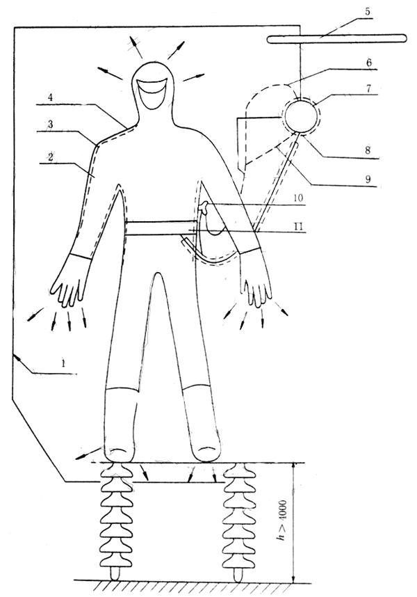 1―旁路等電位線;2―人體皮膚;3―絕緣連褲內(nèi)衣;4―屏蔽服;5―高電位線;6―測量電流I2時的連線;7―屏蔽起來大微安表;8―接點(香蕉觸頭);9―測量電流I1時的連線;10―衣服上的連接處;11―皮膚上的連接處,通過一根本10cm寬的穿孔導(dǎo)電布帶緊貼在皮膚上