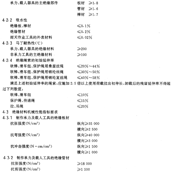 本導(dǎo)則推薦環(huán)氧樹脂玻璃纖維增強(qiáng)型復(fù)合材料和蠶絲繩、錦綸(尼龍)繩等作為制作帶電作業(yè)工具的主絕緣材料;推薦橡膠、硅橡膠、塑料及其制成品等作為帶電作業(yè)工具的輔助絕緣材料。列出了部分絕緣材料的主要電氣性能指標(biāo),作為選用材料的依據(jù)。