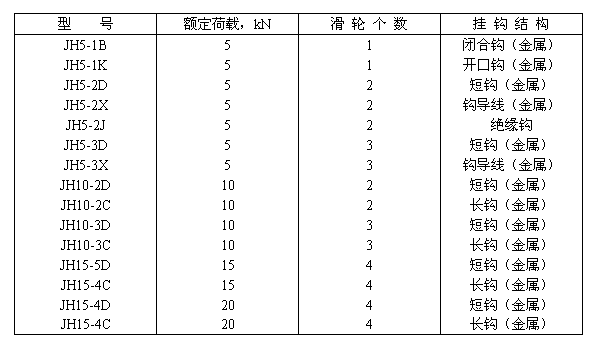 “JH5-1B” 表示5t絕緣滑車,單滑輪,閉合金屬鉤;