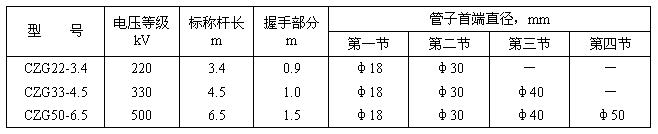 型號(hào)舉例:“CSG22-3.4Z” 表示220kV測(cè)試桿,長(zhǎng)度3.4m,錐形管;