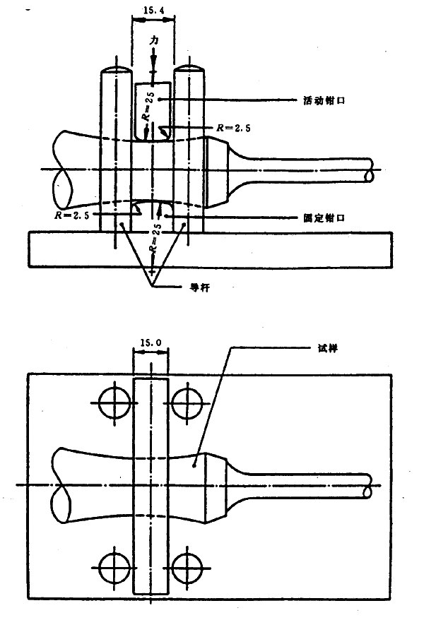 試驗(yàn)時(shí),用鋼鉗把試樣夾緊,鉗口的圓柱體表面半徑為25mm,寬為15mm,長為50mm。轉(zhuǎn)角處有2.5mm圓角。