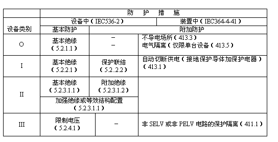 該附加防護(hù)可通過(guò)設(shè)備的適當(dāng)結(jié)構(gòu)(Ⅱ類)或在裝置安裝時(shí)采取措施(如0、1、Ⅲ類),或用兩者的專門組合來(lái)獲得。