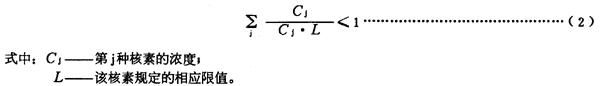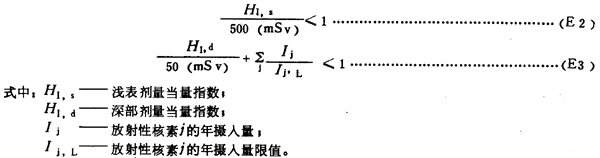 E6 在下述情況下,ALI和DAC數(shù)值不能直接使用:工作人員食入并吸入同一放射性核素時(shí);工作人員受多種放射性核素混合物照射時(shí);工作人員同時(shí)受到內(nèi)照射和外照射時(shí)。在這種情況下,應(yīng)當(dāng)使用式(E2)、(E3)求得: