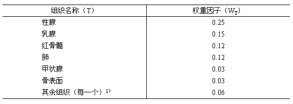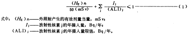 2.4.3.3在一年事件內(nèi)既受到外照射又受到內(nèi)照射時(shí),應(yīng)滿足(1)式和2.4.2.4中關(guān)于器官或組織的年劑量當(dāng)量限值的規(guī)定: