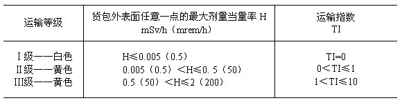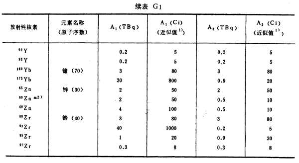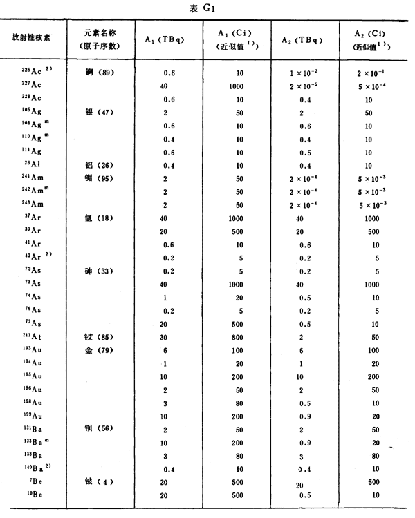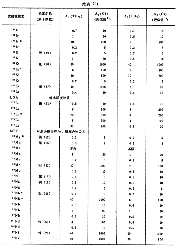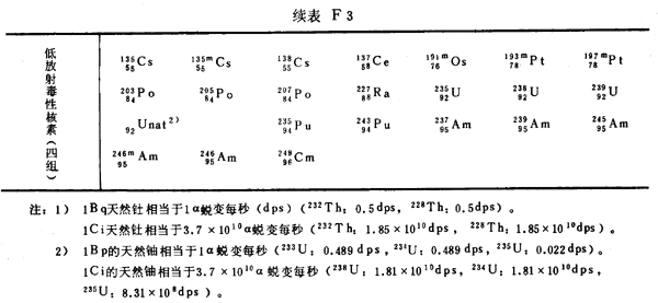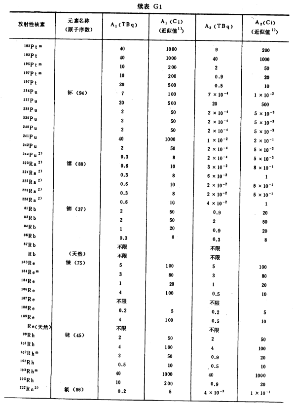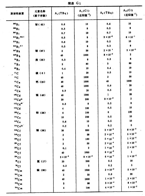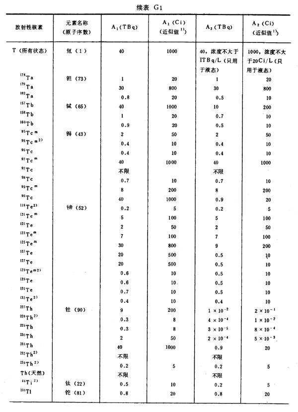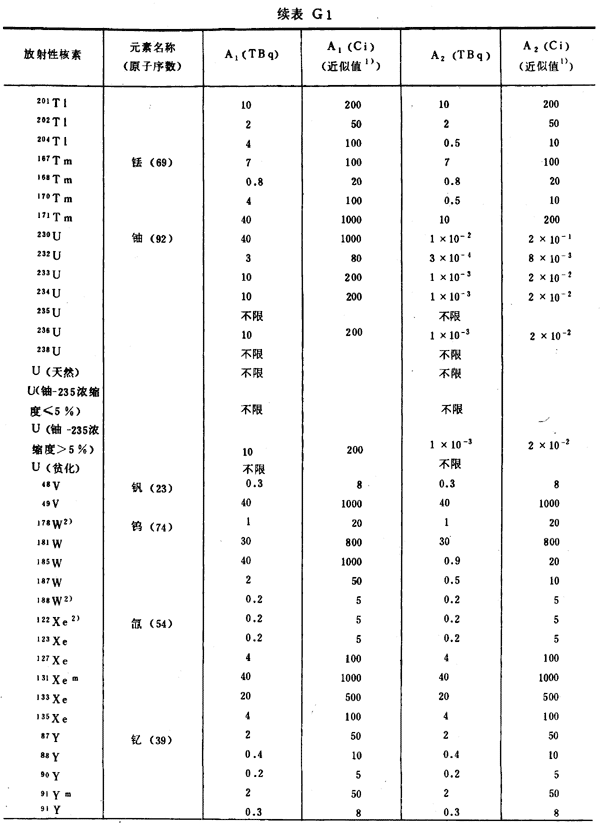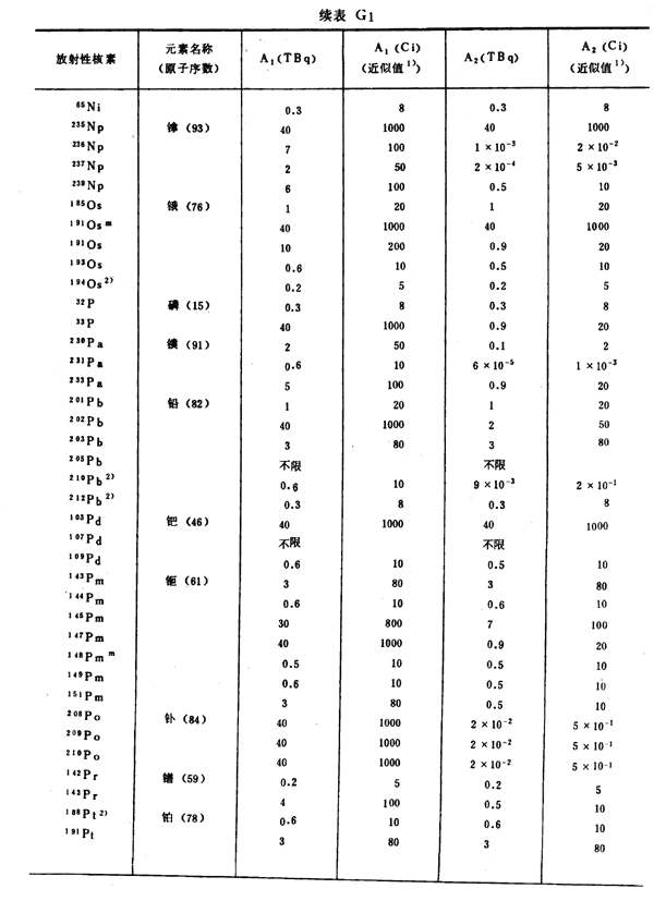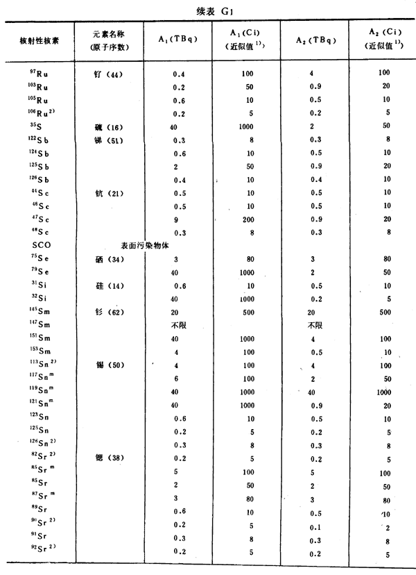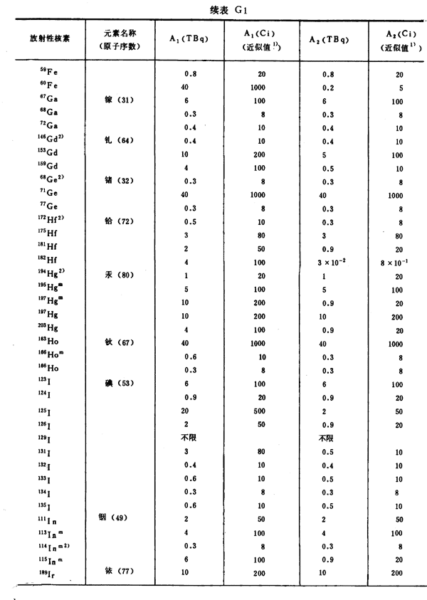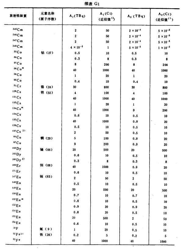 注:1)所引用的居里值,由T Bq轉(zhuǎn)換成Ci后,經(jīng)舍去小數(shù)取整數(shù)而得到。
