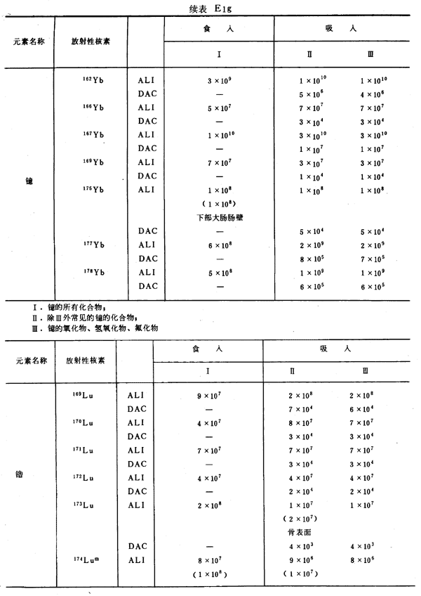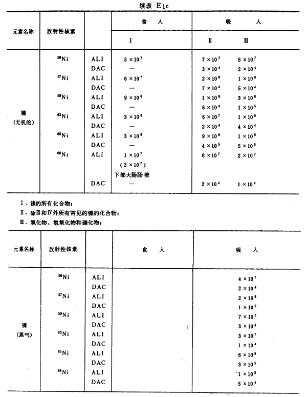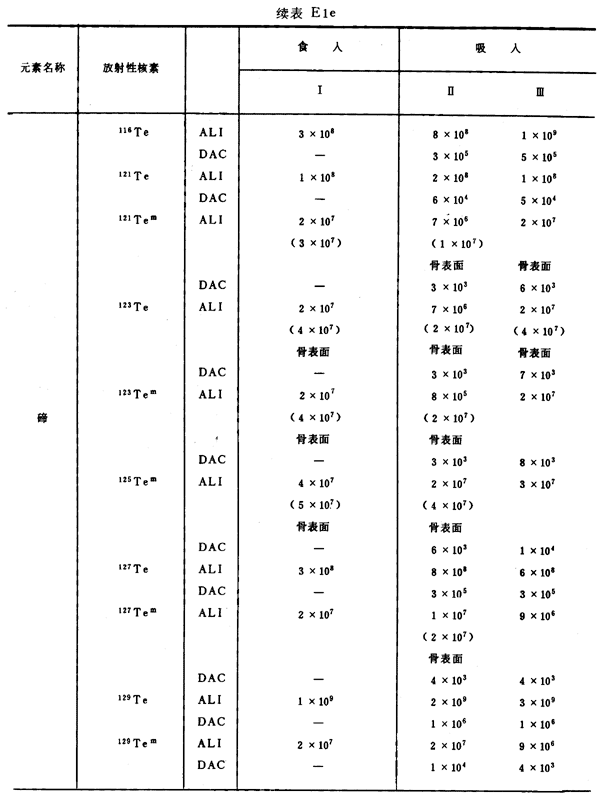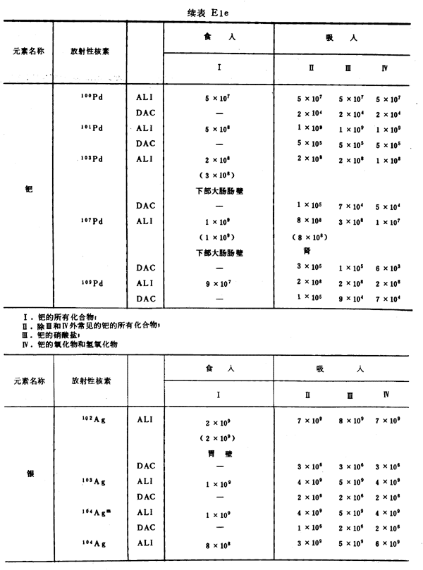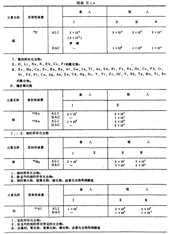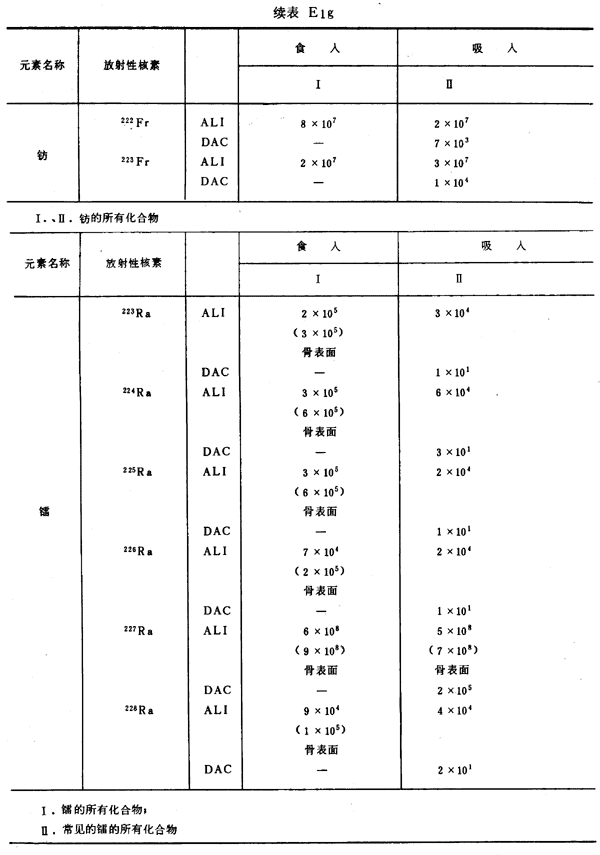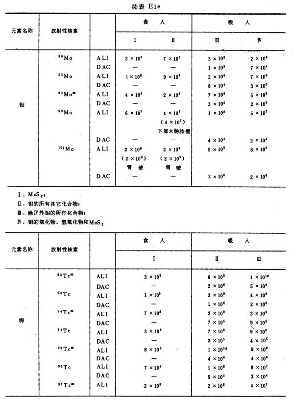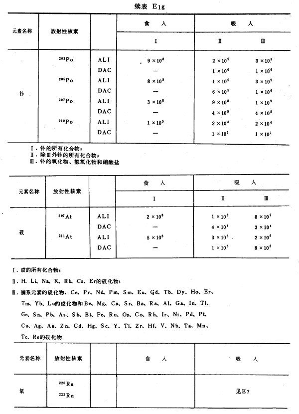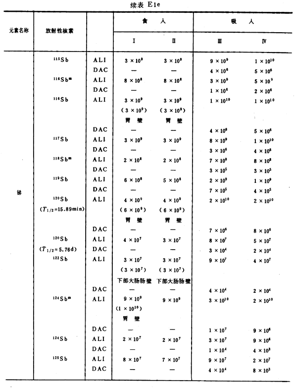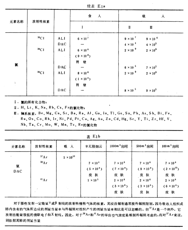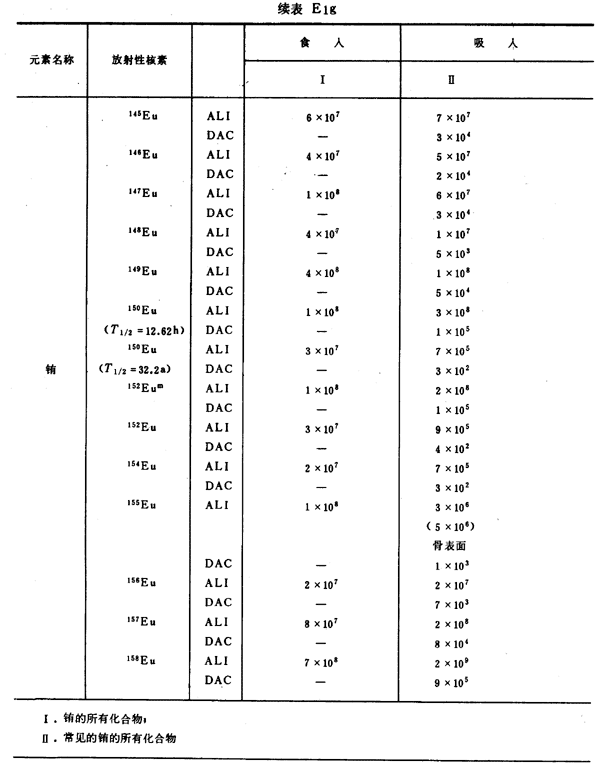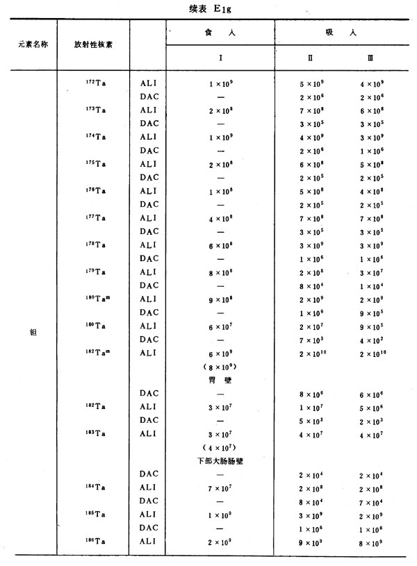 E8 表E1a~E1g中給出每一元素的各個(gè)核素的年攝入量限值A(chǔ)LI(Bq)和導(dǎo)出空氣濃度DAC(Bq/m