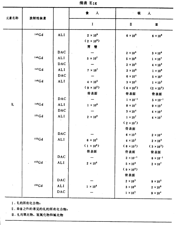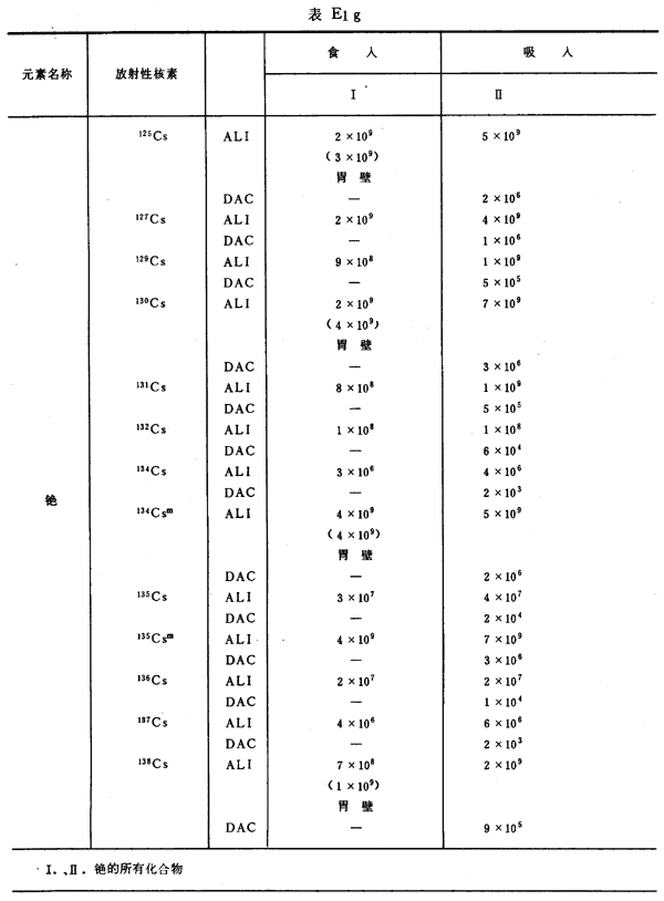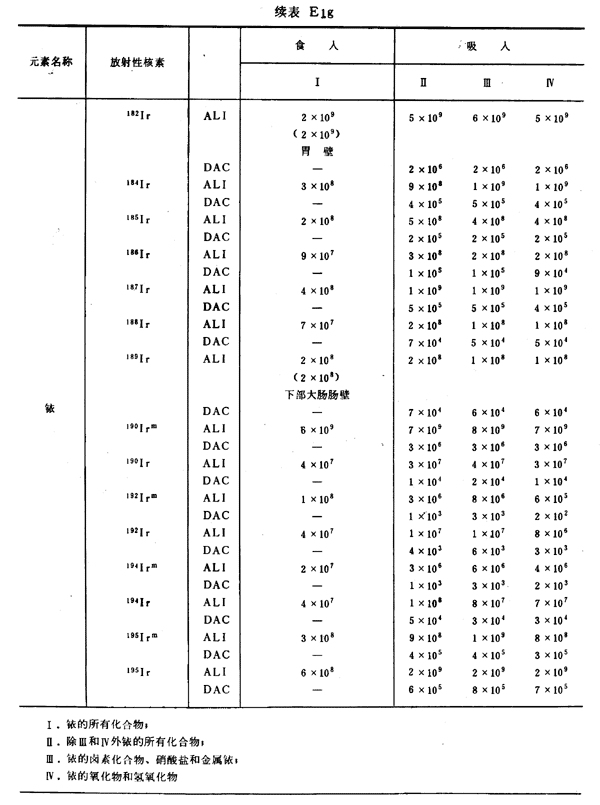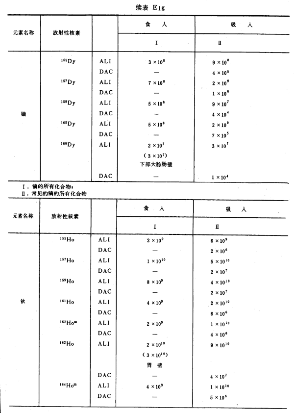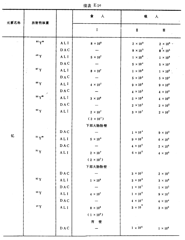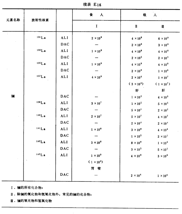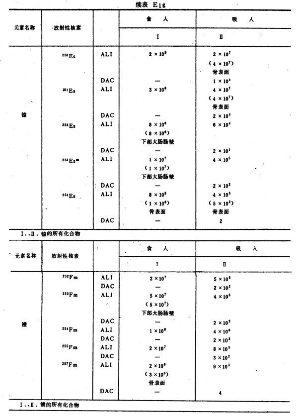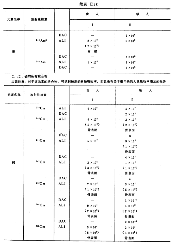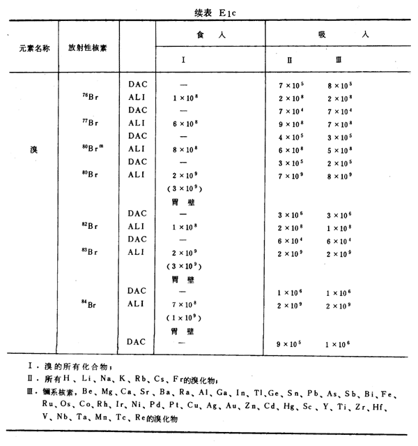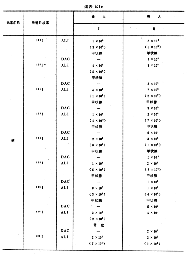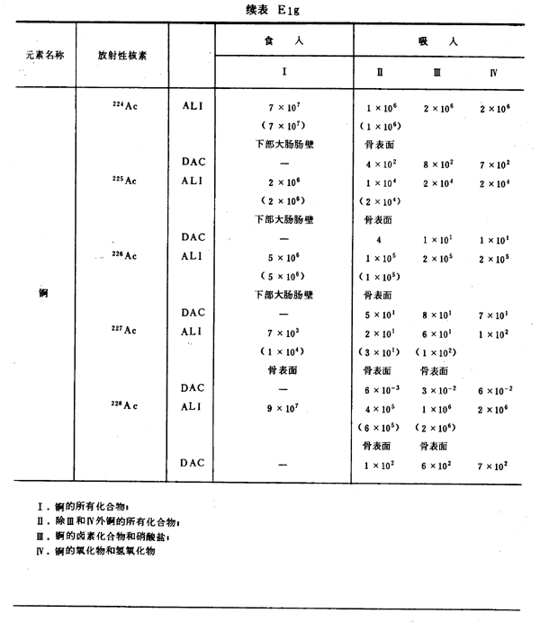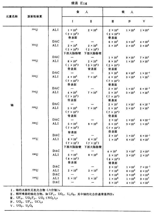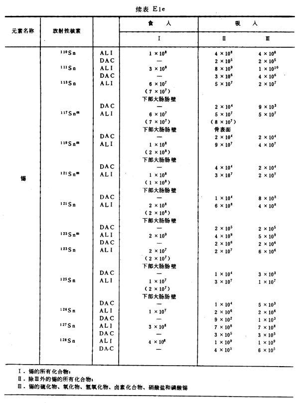 E8 表E1a~E1g中給出每一元素的各個(gè)核素的年攝入量限值A(chǔ)LI(Bq)和導(dǎo)出空氣濃度DAC(Bq/m