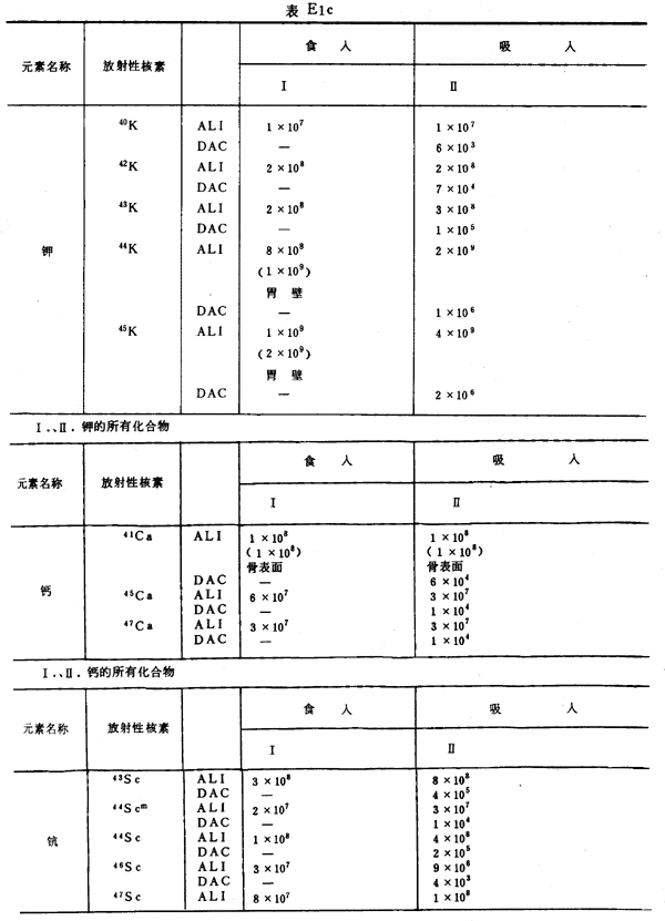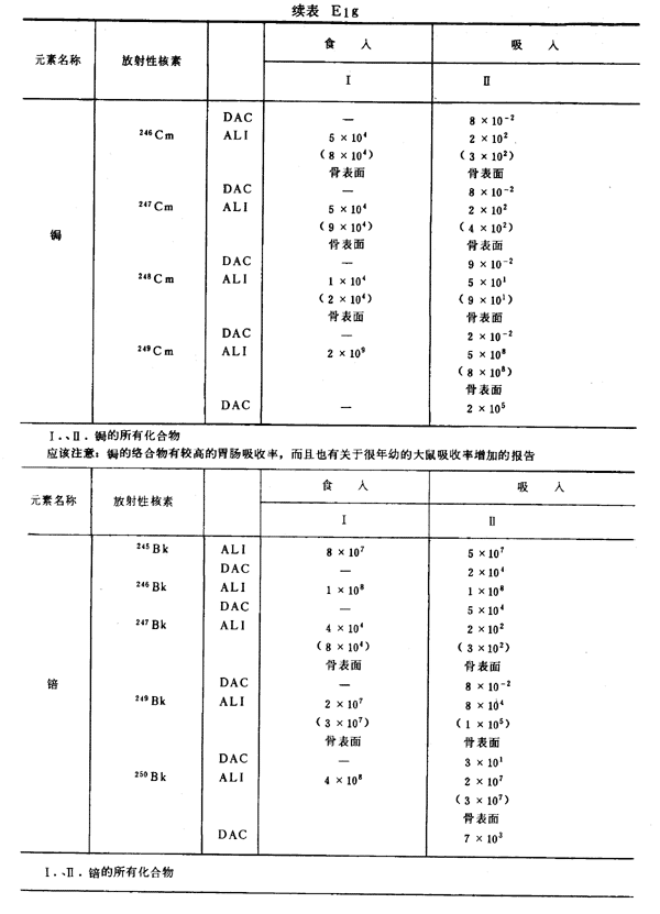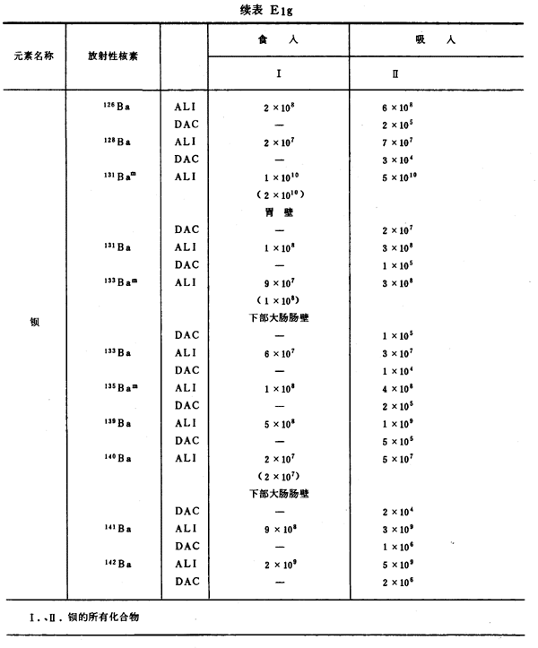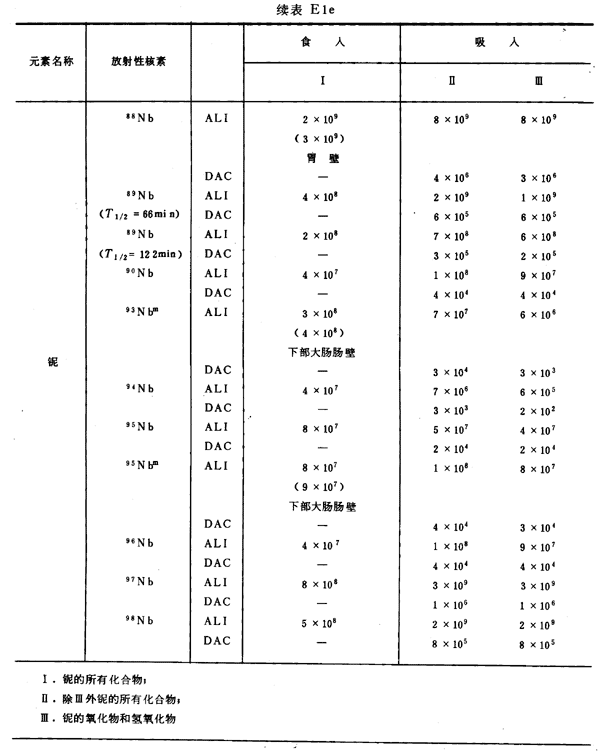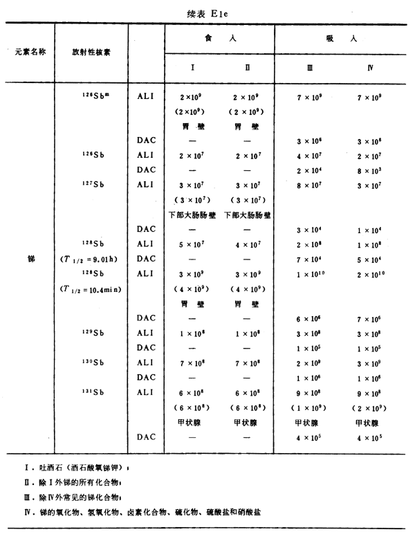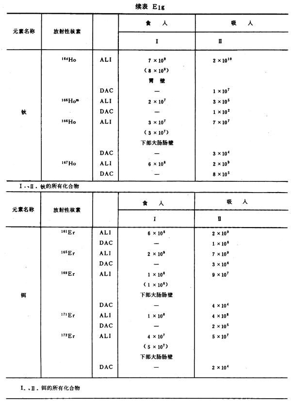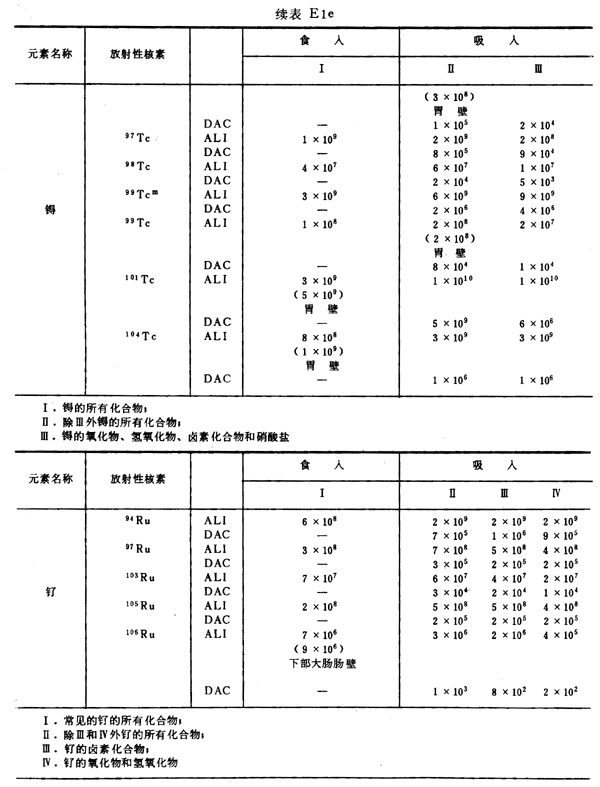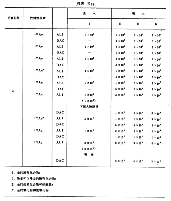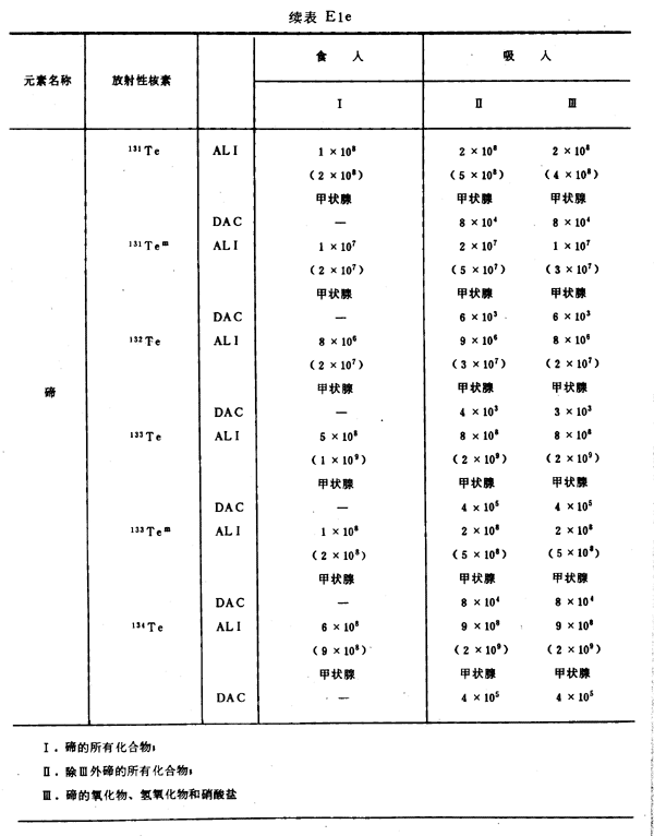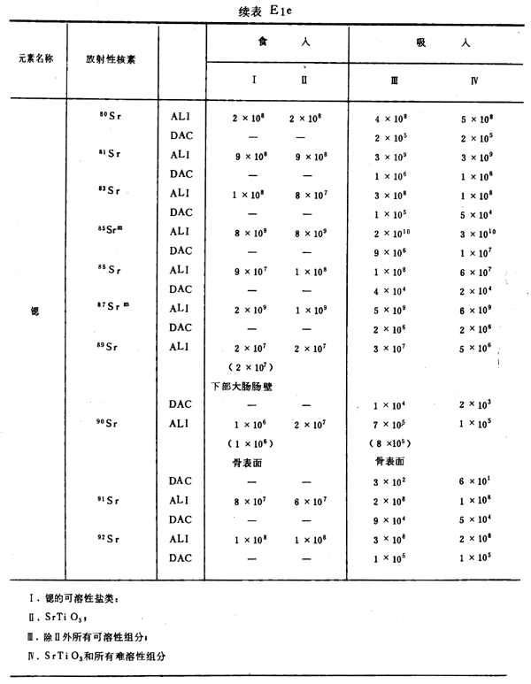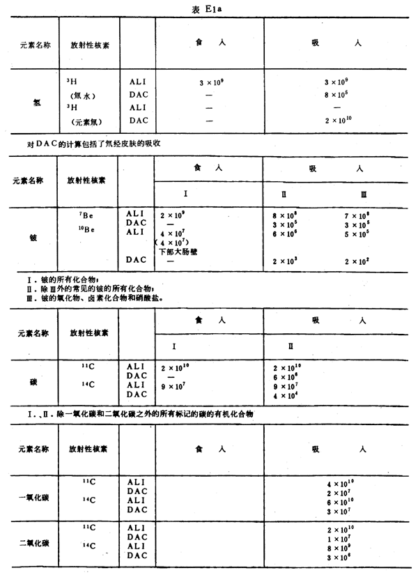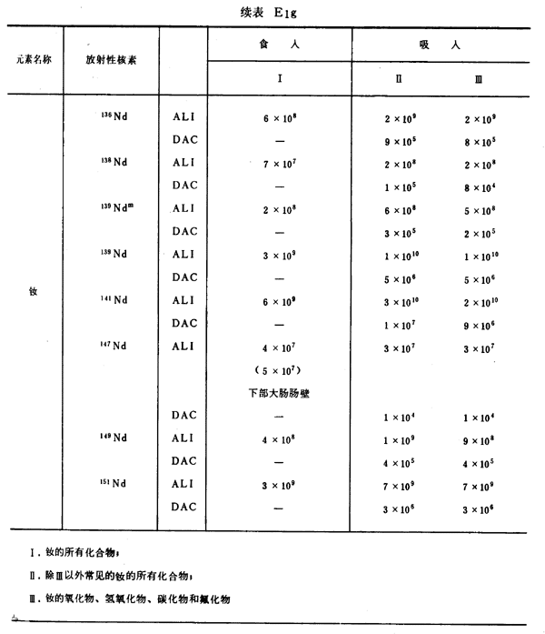 E8 表E1a~E1g中給出每一元素的各個(gè)核素的年攝入量限值A(chǔ)LI(Bq)和導(dǎo)出空氣濃度DAC(Bq/m