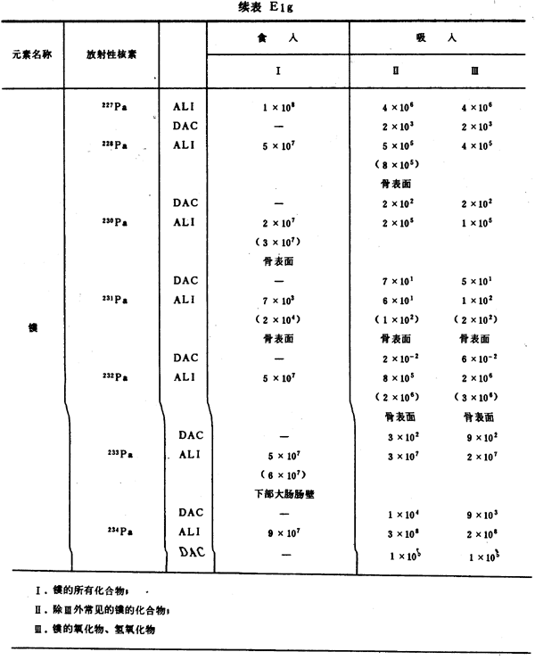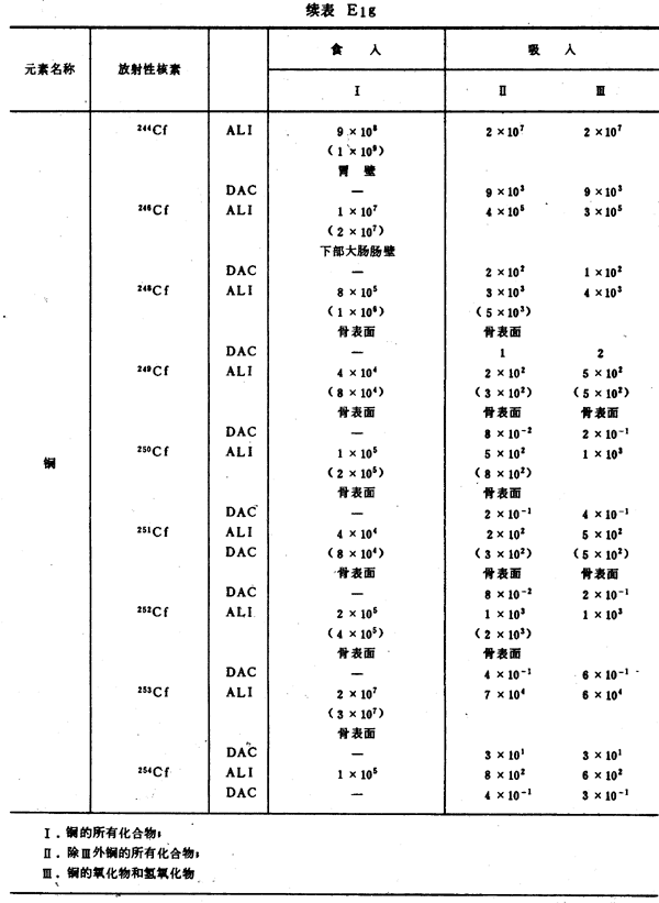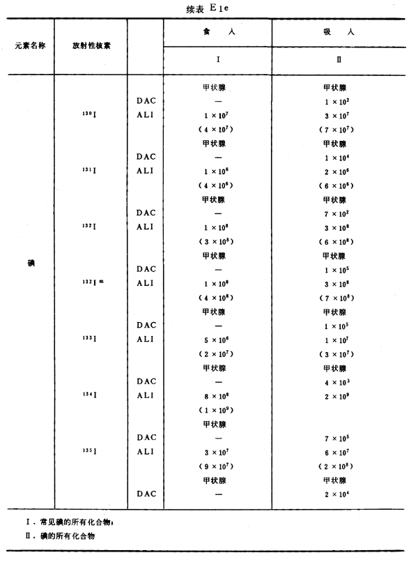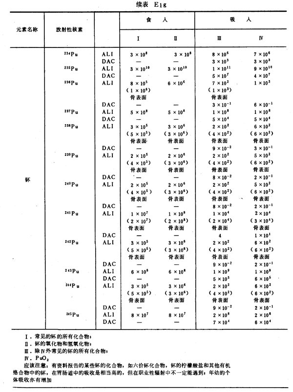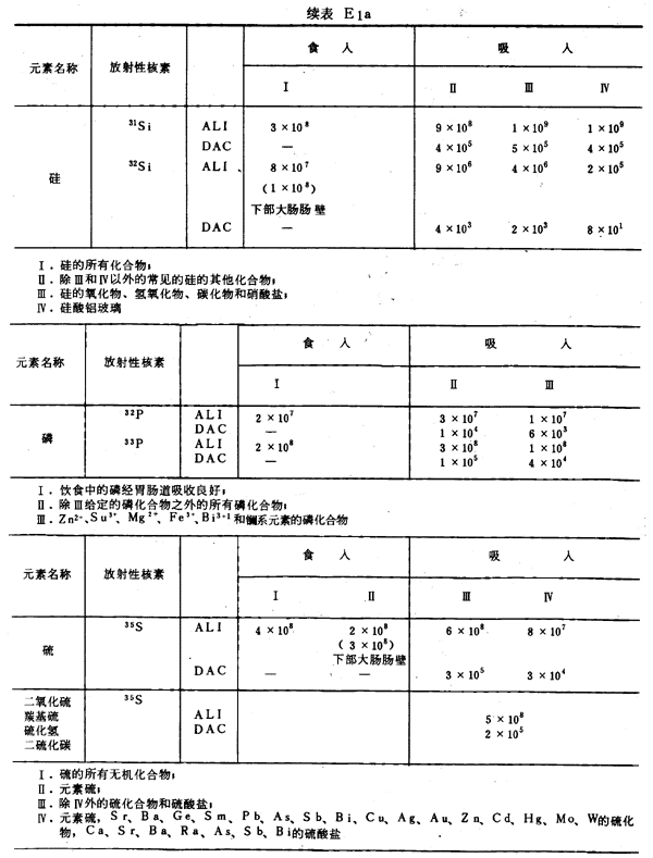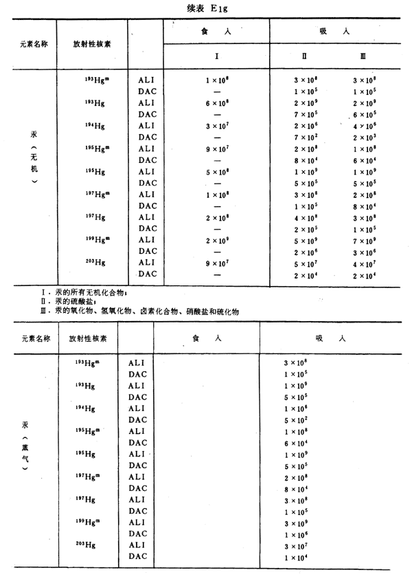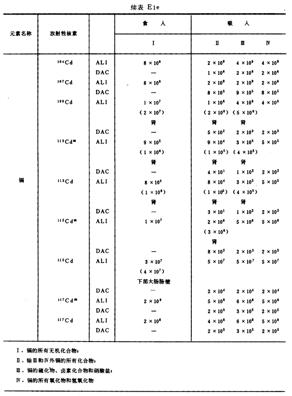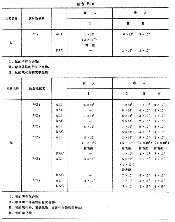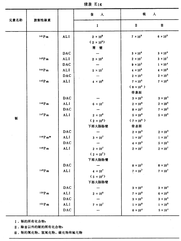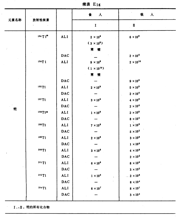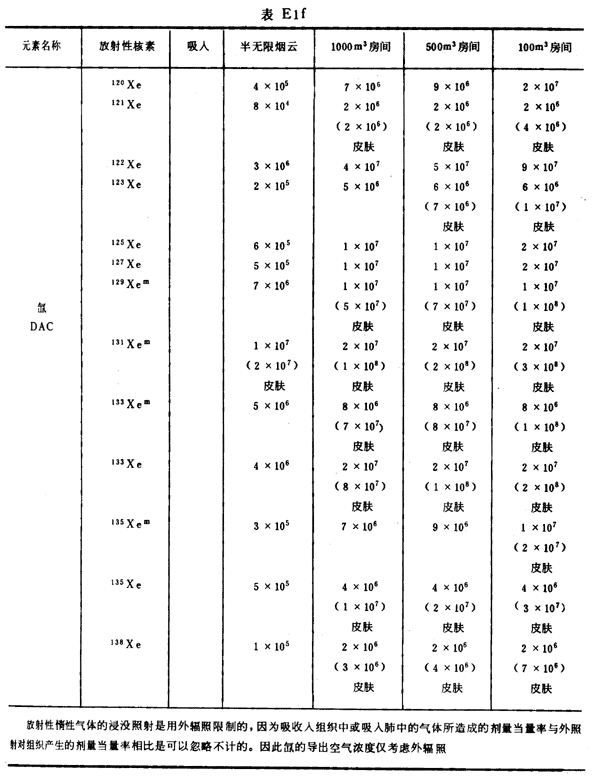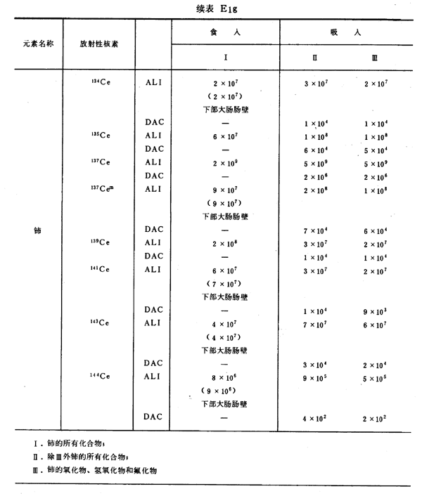 E8 表E1a~E1g中給出每一元素的各個(gè)核素的年攝入量限值A(chǔ)LI(Bq)和導(dǎo)出空氣濃度DAC(Bq/m